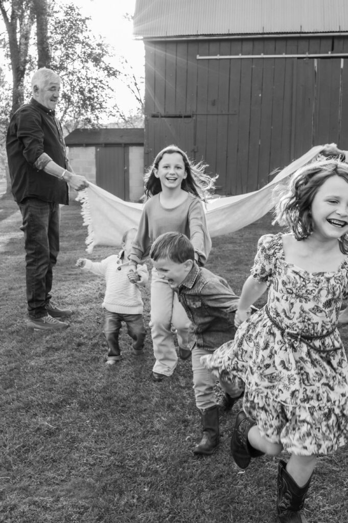 On this golden evening, three generations stood in the same place their story began. Grandparents. Their children. Their grandchildren. Laughter carried through the trees. Little hands reached for Grandpa. Grandma leaned into the love of her life. A blanket lifted into the air as grandkids squealed underneath it.